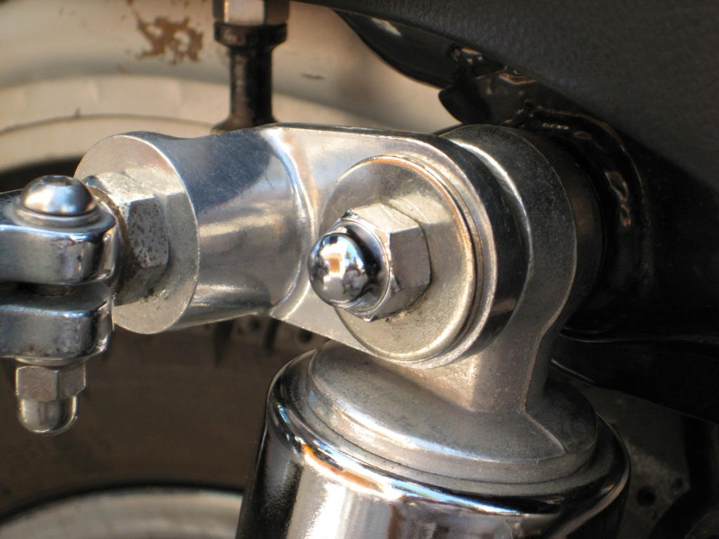 The brackets came with a set of AM rear footpegs from thor212 on eBay. I couldn't use the pegs, but they are dinky. The brackets worked a treat after a bit of adjustment, partially countersinking with a 16mm countersinker, to fit over the upper rear suspension mounts. The grey tubing covering the ends of the studs and the wires is just a stripped-off length of multicore cable jacket.