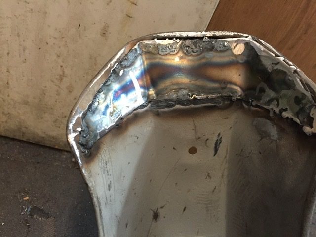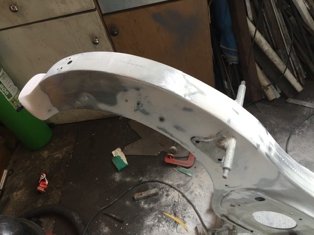 The inner sections were fabricated and tacked in place, these I could do in one piece so will help with the strength.I decided against trying to put a rolled edge on the inner panels like the originals as that is what trapped the mud and started the corrosion in the first place. I’ll also spray some under seal under the mudguard to hopefully prevent any more rust in the future. I tried the cast aluminium sections on and they sit fine and there were no more problems with the mudguard alignment even once the seam welding was done. One of the fiddliest bits to do was the wedge shaped section right on the end of the mudguard, it has two ridges and curves in three directions so a rough approximation was tacked in place and with some gentle tapping as I went persuaded it to conform, a smear of filler helped.