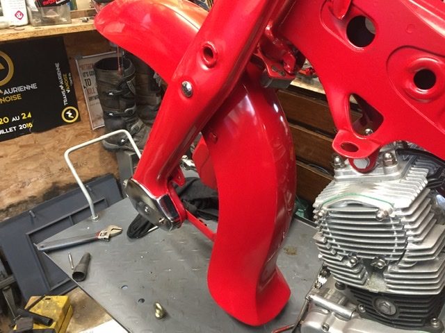 Rear shocks rebuilt, the homemade spring compressor works well. I had to respray the front mudguard as I went through to the primer along the edge, amateur mistake.