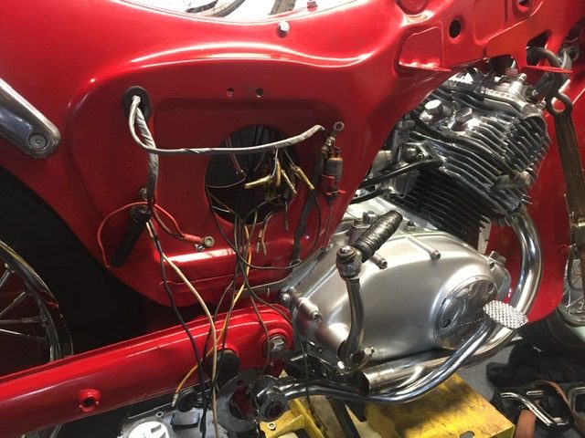 The little Honda nears completion, a bit more wiring to sort out and the exhaust mounting/footrest/rear brake pedal is giving me a bit of grief. I managed to remove the snapped off screws holding the rear indicator lenses, I’ve ordered new screws and hope the thread pitch is correct. I’ve had to order different hand grips as I originally toyed with the idea of spraying the bike yellow and bought some yellow grips but they would clash with the red! Once the battery arrives and the wiring is finished I’ll have a go at starting it.