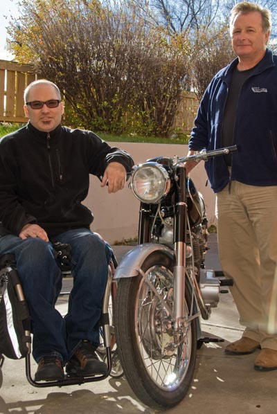 Attached are a couple of shots. The first is a pure cheesecake shot, and the second, that's me and the bike's second owner. He bought the CB77 used in 1969 -- sold it to me in 1994, and I just sold it back to him late in 2008. Doesn't a guy deserve the bike he had 40 years ago?