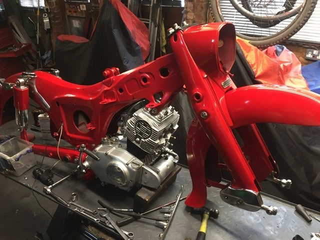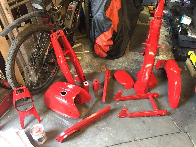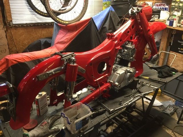 Just started the laborious process of flatting and compounding the paintwork now it’s had a week or so to harden off. Two pack would be quicker but I don’t have the facilities so it has to be the old fashioned way. I did find I’d missed a few coats just on one side of the swinging arm so had to respray that again. Not a big deal but that will now need a few days to harden off too. I’ve just hung a few bits on the frame to remind myself what it should look like and spur me on to build up the rear shocks. I’m pleased with my final choice of colour, it was nearly Yellow!