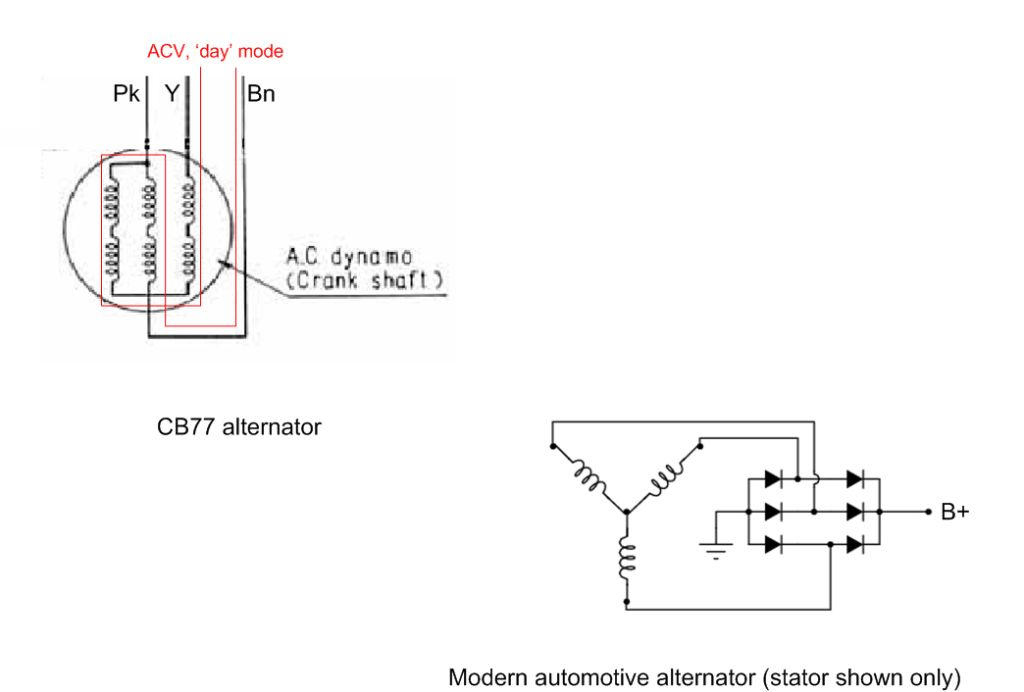 I'm ad-libbing now, but I do remember overcoming a faulty alternator - until I found the dry solder joint on one of the alt coils - on my CB77 by switching on the lights: when the lighting switch is operated it bridges out two of the three coils (it links the Pink & Yellow), thus increasing the current available to support the lighting whilst still (hopefully) trickle-charging the battery. This design, coupled to the old, heat-producing selenium rec, was Honda's idea of charge regulation; simple but appallingly inefficient. In the nearly-fifty-years or so since the system was first thought up, battery technology has moved forwards a bit and, as a result, such stringent charge-attenuation is no longer the issue.