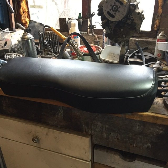A couple more steps forward, a bit more chroming and the seat recovered. The seat base was the usual rusty mess with a tear and some of the foam missing. I glued some foam salvaged from an old MX seat to the original foam and reprofiled it using an angle grinder and a sanding disc. I cleaned off the loose rust and treated the remainder with some rust remover before applying a few coats of paint. The recover was then a simple job of stretching it over the foam and base, luckily the spikes that retain the cover were mostly still useable.