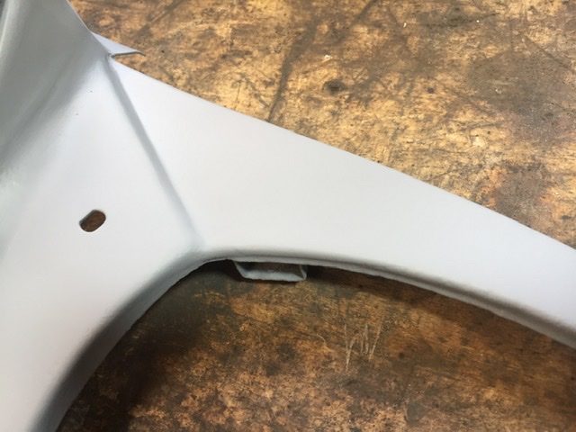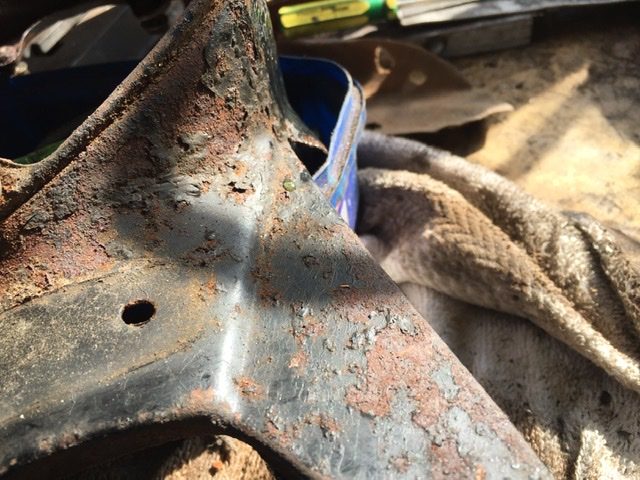 Here’s the headlamp surround that was heavily corroded, once I’d ground off the surface rust I treated the pitted areas with some rust remover and then gave it a light skim of filler to level up the deep pitting. Some more work flatting that then a light coat of primer. Once the primer had hardened I again flatted to fill in any pin holes before a couple more coats of primer. I did at one stage consider trying to find a replacement but there’s no rush so I just plodded on.
