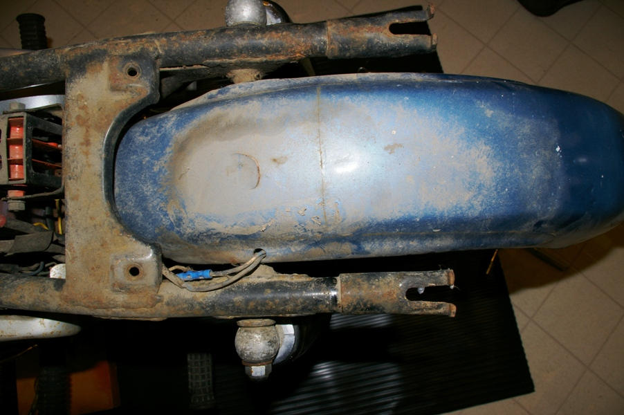 The bike will have to be stripped to the frame for cleaning and repainting, and it looks like the rear fender has already had some body work done to it (probably related to the twisted seat).