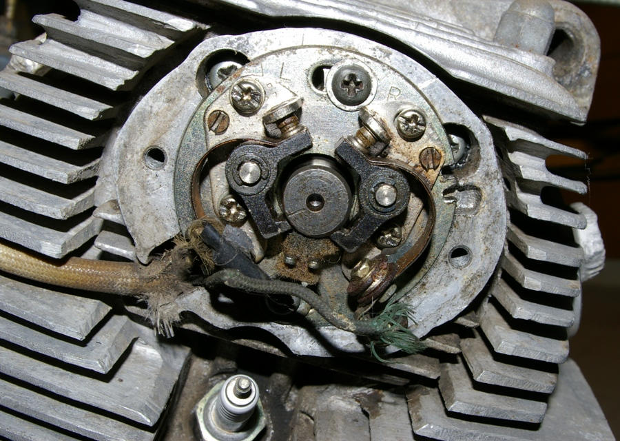 Add new points and condensers to the Retrobikes parts list. In a few days I might be able to rotate the points cam from its resting place of 35 years (just a few degrees before TDC on the left side).