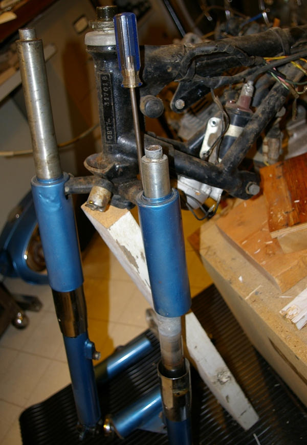 It's day 6 and time to tackle the front forks--the right one has been leaking all along, so they will both get new seals sometime soon. Fortunately there was a selection of steering damper rods in the spares box (I'm thankful to the donor for having held onto some of this stuff--he must have had an eye to restoring it at one time). I'll mix up a new batch of plating solution and make the metal parts all nice and bright again.