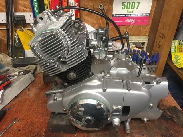 I was in the process of rebuilding a triumph for a friend when it turned up so progress will be intermittent but, in between work on the triumph I’ve stripped and rebuilt the engine. It was locked up but had the carb had been left on and stored in the dry so I was hopeful that pouring some penetrating oil down the bores would free it off. After a couple of days I put a spanner on the crank and it released it’s grip. Once stripped the bores weren’t too bad and a light hone and some new rings would be sufficient. The valves were passed their best so a set were sourced from Thailand but the rest of the engine was ok. The only other problem was the kick start pawl was bent, possibly by someone trying to free off the engine. I did find one on the net but the asking price was crazy so I heated it up and tweaked it straight. I might regret that if it snaps but figured I’d be using the starter motor most so took the chance. The engine is now finished and sitting on the shelf while a bit more of the Triumph has turned up and needs my attention.