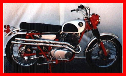 Here is the pic I was given at the HONDA library in 1990 and shows a RED 1965 CB77 with the silver TL bracket. HONDA had one more actual photo paper copy when the librarian gave me this one. ......lm