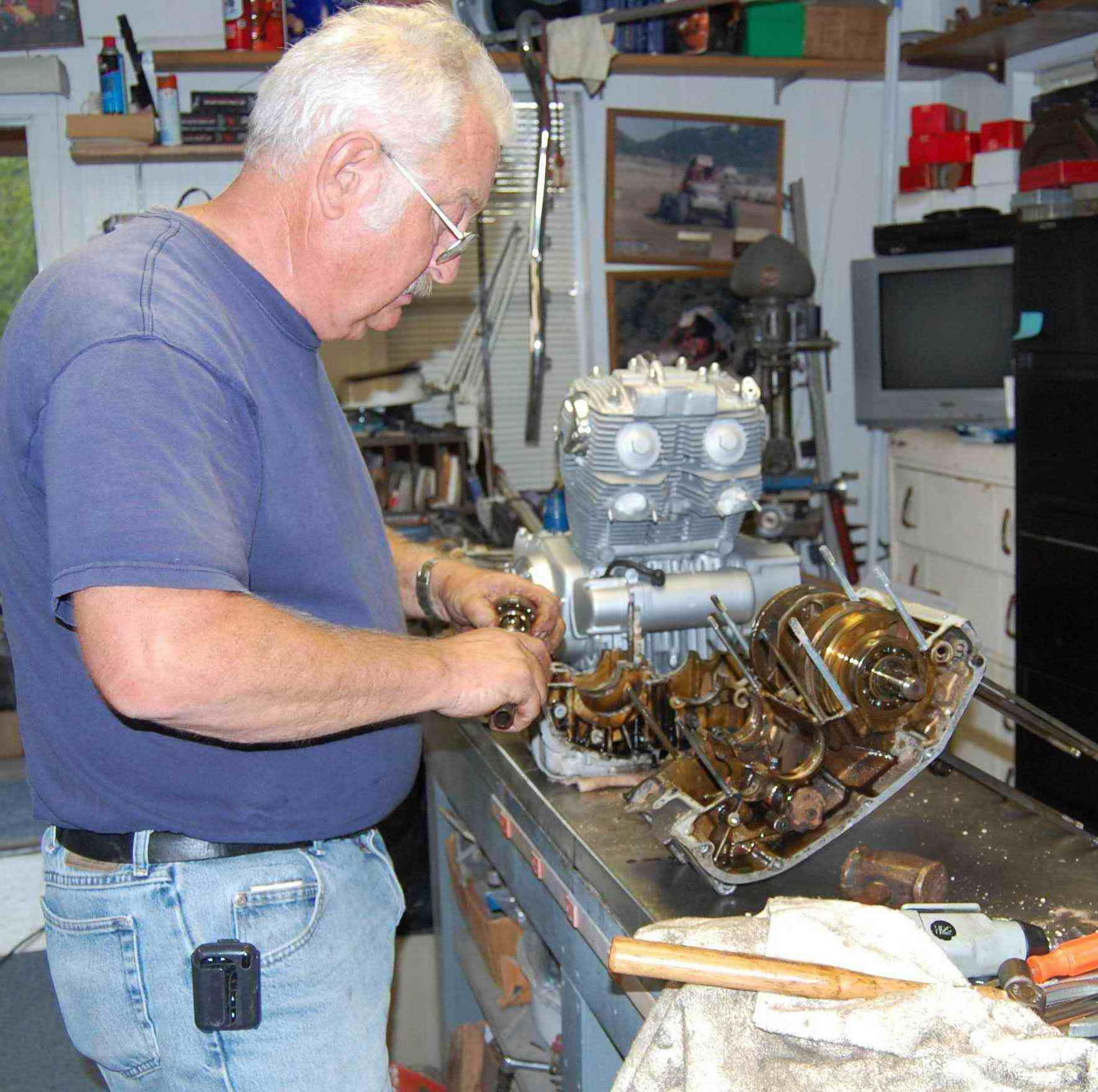 I’ve been on his waiting list for at least six months (or a year and a half if you count our first contact), so on a beautiful late October day I loaded up my cruddy ol’ engine and a bunch of “show and ask” items and an eight page list of questions and parts needed and headed out to Kerrville to visit my new friend and hero Ed Moore. Stopped in Blanco to pick up my friend Charlie, who rides a ’74 Moto Guzzi café racer. (Ed said he wouldn’t hold that against him, but if he ever showed up on it he’d have to park it where it couldn’t be seen from the house or the street.) At any rate, we got in about mid-afternoon, and after helping move a little furniture we got down to business.