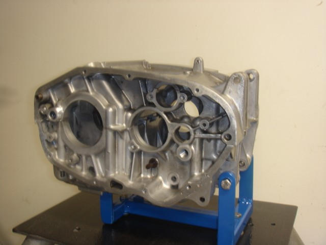 That plate is the top of one of my roll around bike build stands, I just spin the whole mess around. Once you get the trans and crank in and bolt the halves together, it works fine for everything else.