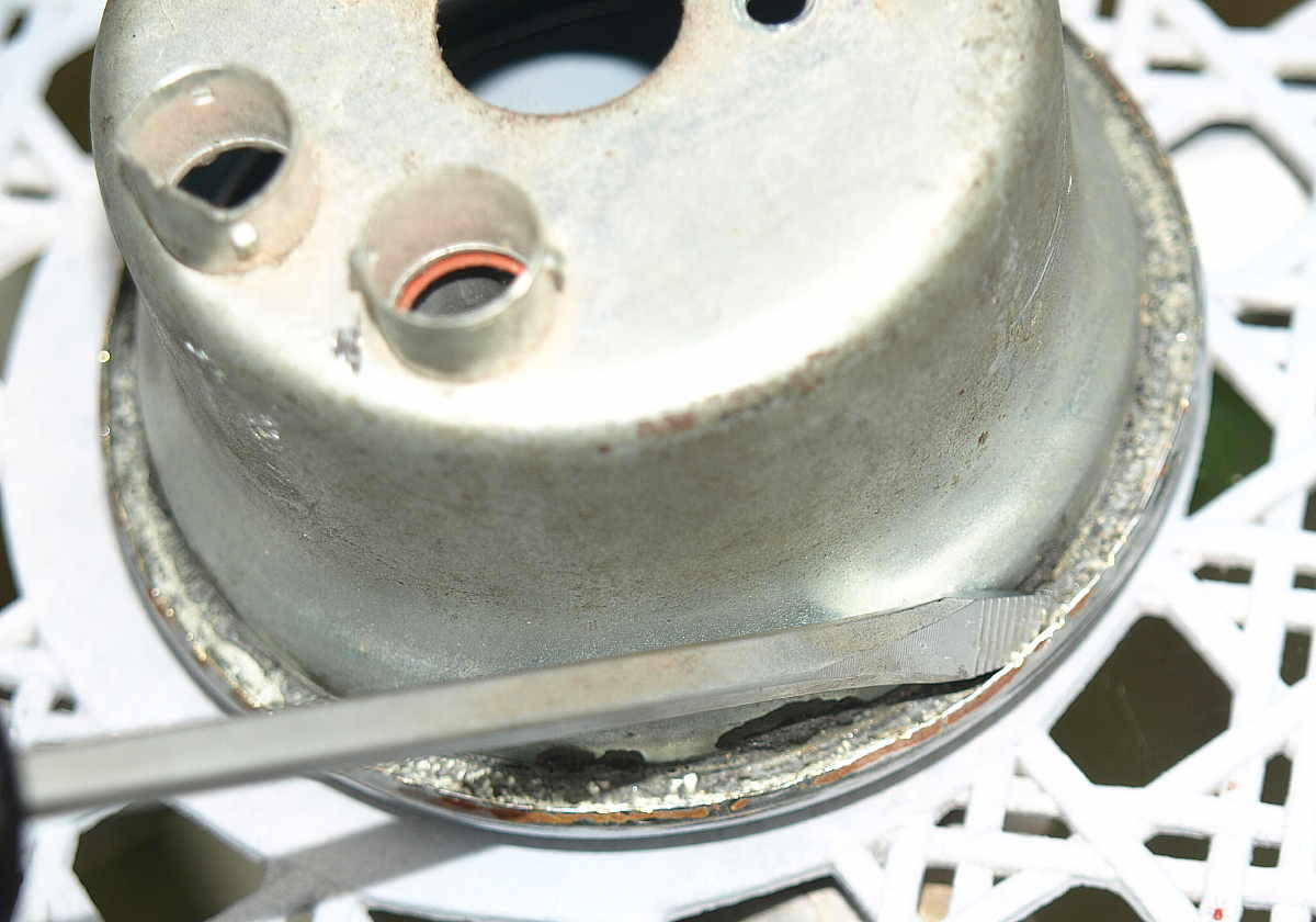 I managed to buy a set of three non-working speedos on ebay with various ailments but two had good bezels, so I set about dismantling one as carefully as I could. I found that the bezel could be prized away from the speedo body (see below) with minimum damage using succesively larger flat-bladed screwdrivers to turn the edge over.
