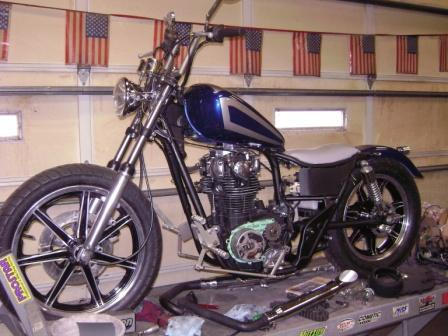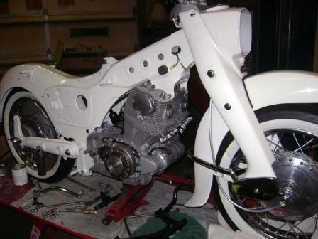 frame was sandblasted, there was a crack on the rear fender that i had to weld up. replace front fender with a ebay fender. she is wearing base coat clear coat white. all the chrome pieces arrived. all i can say is wow the bike is going to look like it ro
