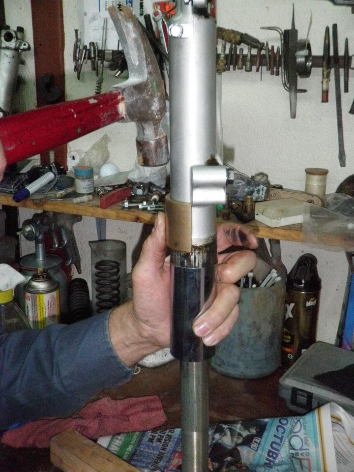 A bit of tapping on the cover, and off it came with no damage and no problems. I suppose if you don't have a large, bronze bushing like my friend did, you could find a piece of pipe. It just needs to fit pretty snug on the chrome cover. Once off, you can take out the snap ring, and the seals come right out like described in this forum elsewhere - just pull sharply on the inside tube, and the seal will come out.