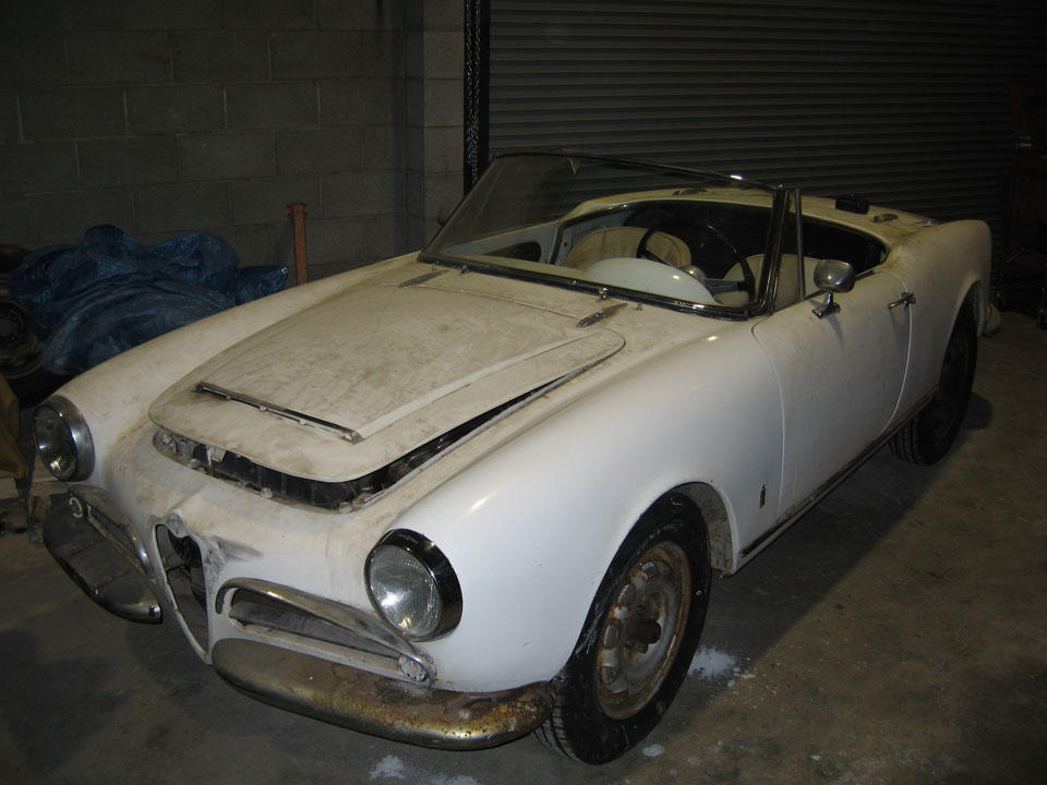 The red car is my 1959 Alfa Romeo Giulietta Sprint. Originally a 1300cc 4 speed drum brake car, it now has a 1750cc engine, a 5 speed and disc brakes all around. I have the original parts and will probably restore it some year. A totally rust free Alfa- yes that is rare!