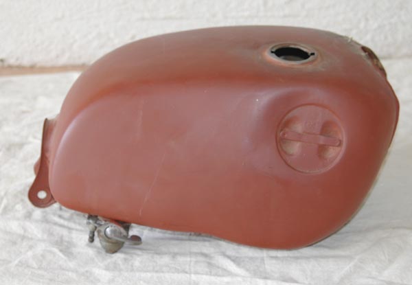 First to go is the gas tank and it is no prize. The previous owner ground off the mounts for the knee rubber and there is rust inside the tank. It is in need of sealing and has a small leak high on the left front that the sealer should take care of. An ugly tank for sure BUT there is a bright side. I am including an excellent fuel petcock mostly because I could not get the darn thing off.