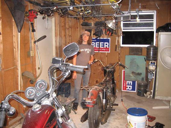Update 3-19-07: Finally cleaned garage out, amazing how much stuff I have collected (just throw it all out). Well fighting my urge to totally strip the bike down and do a complete restore, I have come up with a strategy. I plan on getting the bike running mechanically sound drive it awhile and later on do a complete restore. Today I pulled the tank off and using the rust removal method I read in VJMC using pool chemicals and a battery charger. It is making bubbles and a nasty foam, I guess I will see if it works by tomorrow. Also I pulled the carb’s and disassembled, I will soak in carb. Clean tank at work. The bowl gaskets where glued on, so I do not know if they will survive the soak. If not I believe I can make some with gasket material. I pulled the battery and will try to match up one at the auto store (will find out). My biggest hurtles will be to get a key, I got her running by hot wiring. I will try the classified ads on VJMC. Lastly I need to get rims and tires. One last thing I will need is a seat. Will update as I progress.