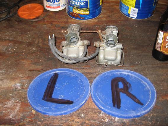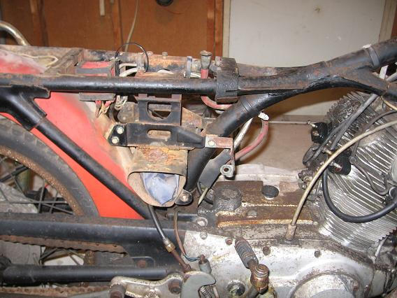 Update 3-19-07: Finally cleaned garage out, amazing how much stuff I have collected (just throw it all out). Well fighting my urge to totally strip the bike down and do a complete restore, I have come up with a strategy. I plan on getting the bike running mechanically sound drive it awhile and later on do a complete restore. Today I pulled the tank off and using the rust removal method I read in VJMC using pool chemicals and a battery charger. It is making bubbles and a nasty foam, I guess I will see if it works by tomorrow. Also I pulled the carb’s and disassembled, I will soak in carb. Clean tank at work. The bowl gaskets where glued on, so I do not know if they will survive the soak. If not I believe I can make some with gasket material. I pulled the battery and will try to match up one at the auto store (will find out). My biggest hurtles will be to get a key, I got her running by hot wiring. I will try the classified ads on VJMC. Lastly I need to get rims and tires. One last thing I will need is a seat. Will update as I progress.