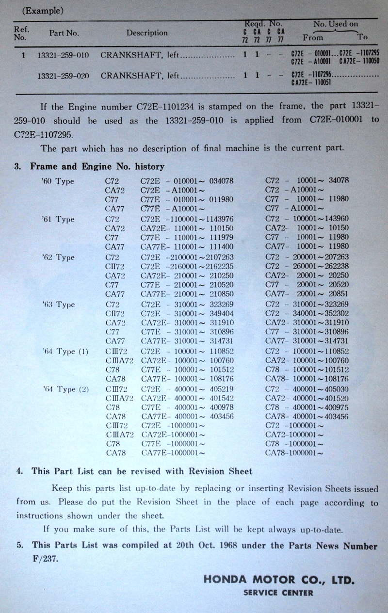 I am going to be rebuilding (at least) one of these engines, and I would really like it to be the 'original,' 'numbers-matching' one. FWIW, I also have (most of) engine C72E1003829, which must have come from that CA72 frame, C721003323.