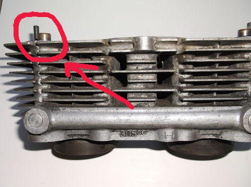 STILL haven't been in to see the bike, but to clarify - the stud that is broken isn't one of the 8 long ones that hold the head to the crankcase. Rather it's one of the small ones that join the two halves of the head, right to the side of the head gasket/spark plug holes. See attached pic.