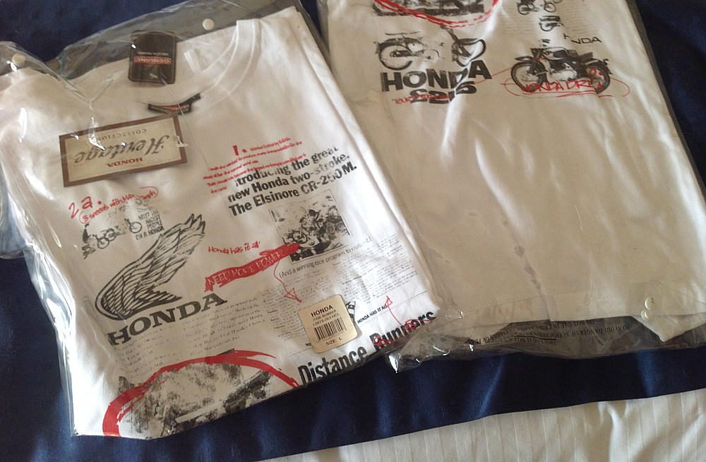 I spotted some Honda T-shirts in a Japanese Classics special edition of Old Bike (Australasia ) available from Hondampe.au ( see link ). The History T-shirt ( Heritage Collection ) has various 60s Honda Ads ( inc "you meet ... " ) and the "Racing through the Ages" ( Dream Collection ) has a pile of racebikes.