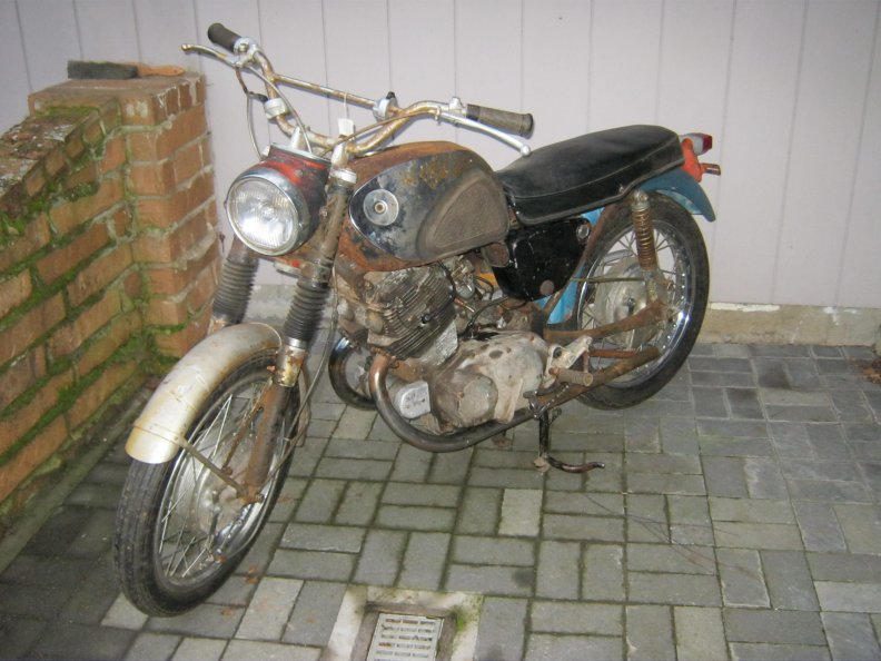 Bought this POS 7 yrs ago and just brought it out of storage. It rolls through with compression so it should run, we'll find out shortly. Tank had a gallon of foul smelling bad gas from probably 30+ yrs ago and I must have dumped out 2lbs of rust. If it runs out okay maybe it should be my new "ratbike", I'll throw some parts at it to make it street legal.