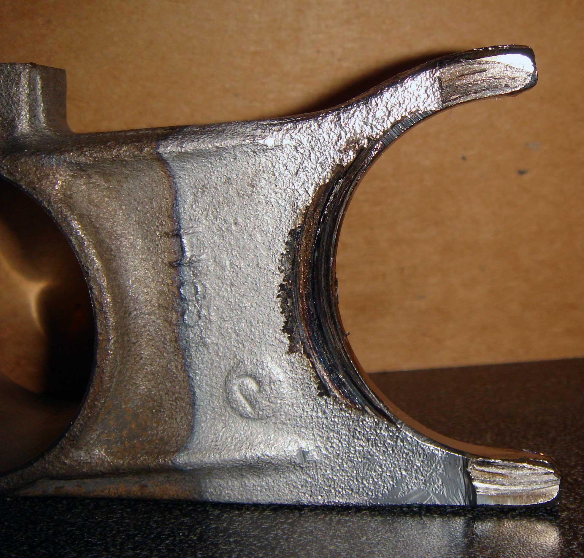 One of the shift forks is obviously toast, but the other only has a little wear at a few points. This isn't a high-dollar project, so if I can reuse at least one of them, it would be nice (but not worth any risk if it's a questionable choice). More than that, however, I'm curious about what causes this type of wear in the first place, and whether or not it necessitates replacing the gears as well.