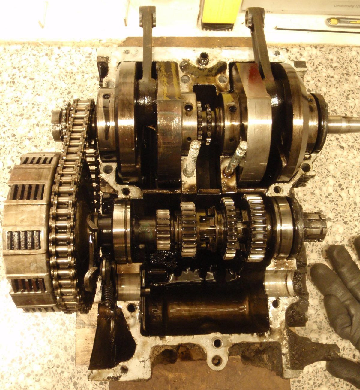 While you split the case push the gear shift arm gently to the clutch, and the cases will split with everything in it. I already disassembled the cylinder and head, but that ain't necessary either. The only thing you have to do is keeping the crank and both shafts into the upper case while splitting.