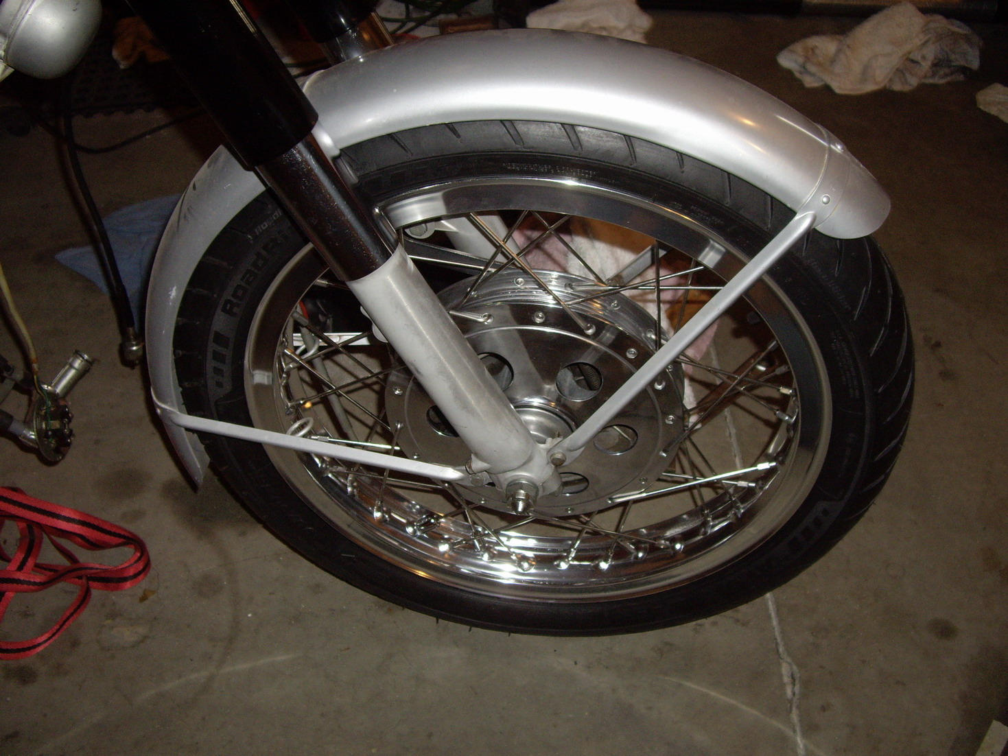 deez - I am using Excel shouldered aluminum rims, 2.15X18 in the rear and 1.85X18 in the front. As for the tires, they are Avon Roadriders, 100/90X18 in the rear and 90/90X18 in the front. I got the rear wheel finished, and it looks great mounted on the bike. I took some more pictures, but outside this time, and they look a little better, albeit a bit out of focus. Now just to strip it down all the way and powdercoat the frame and paint the fenders, sidepanels, etc. I sure can't wait to get this bike finished, especially since I was only able to get in a few rides before it lost spark to the right cylinder, and it seemed like a sign to go ahead and fix her up.