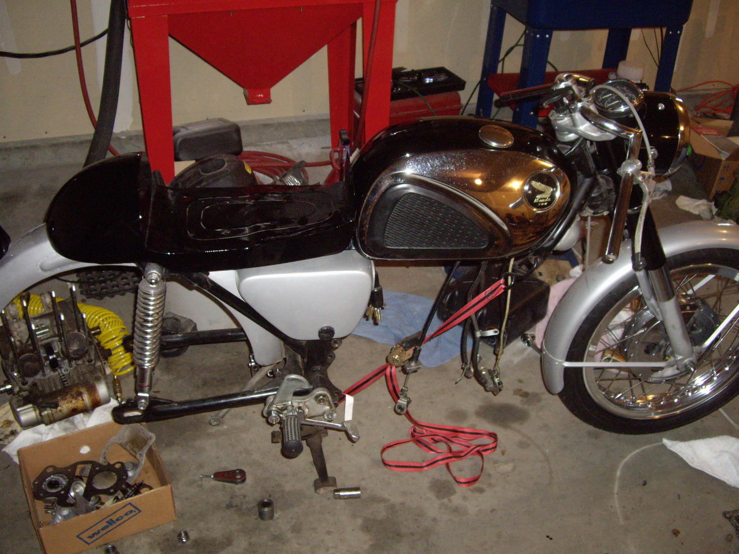 Hello all. Still new to this website, so first of all, thanks for the responses to my other listings regarding my white '65 CB77. It is now completely disassembled, but I have decided to put it on the back burner at least until I get my '67 finished. I just got the seat pan and front wheel finished, and thought that I would share some pictures of how it is looking. The seat was hand made out of sheet metal (not by me) and is still awaiting upholstery. I am planning on going with gray leather. sewn in strips like the old factory racing seats. I had the front hub drilled out, and am using Excel shouldered aluminum rims with stainless steel spokes/nipples. The tires are Avons, and fit very nicely with no clearance problems with the front fender. Still waiting on the rear wheel. I hope to have the top end on the motor within the next week or so. I am leaving it mostly stock, with the exception of a Megacycle cam and electronic ignition. The pistons and rings appear to be fairly fresh (I have the service records since '69 - thanks to some Air Force mechanic) and appear so as well. Well, thats about it for now. Thanks again for the responses, and sorry for the mess in the pictures. My wife isn't too happy about it either.