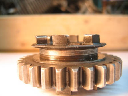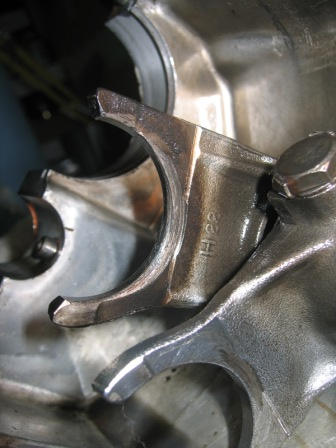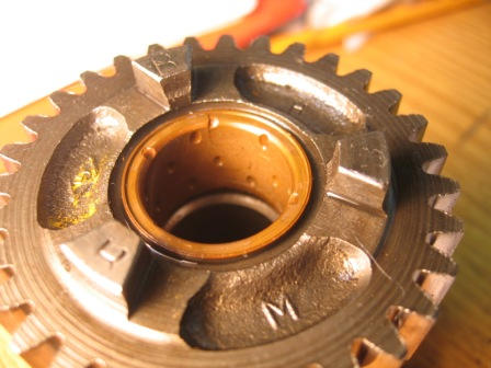 I removed the shift drum and forks and took some photos. Also some pics of the brass bushing and the output shaft bushing and kick pawl. I don't see anything that looks slightly worn except that sliding gear and one fork. I'm welcoming comments on the photos: