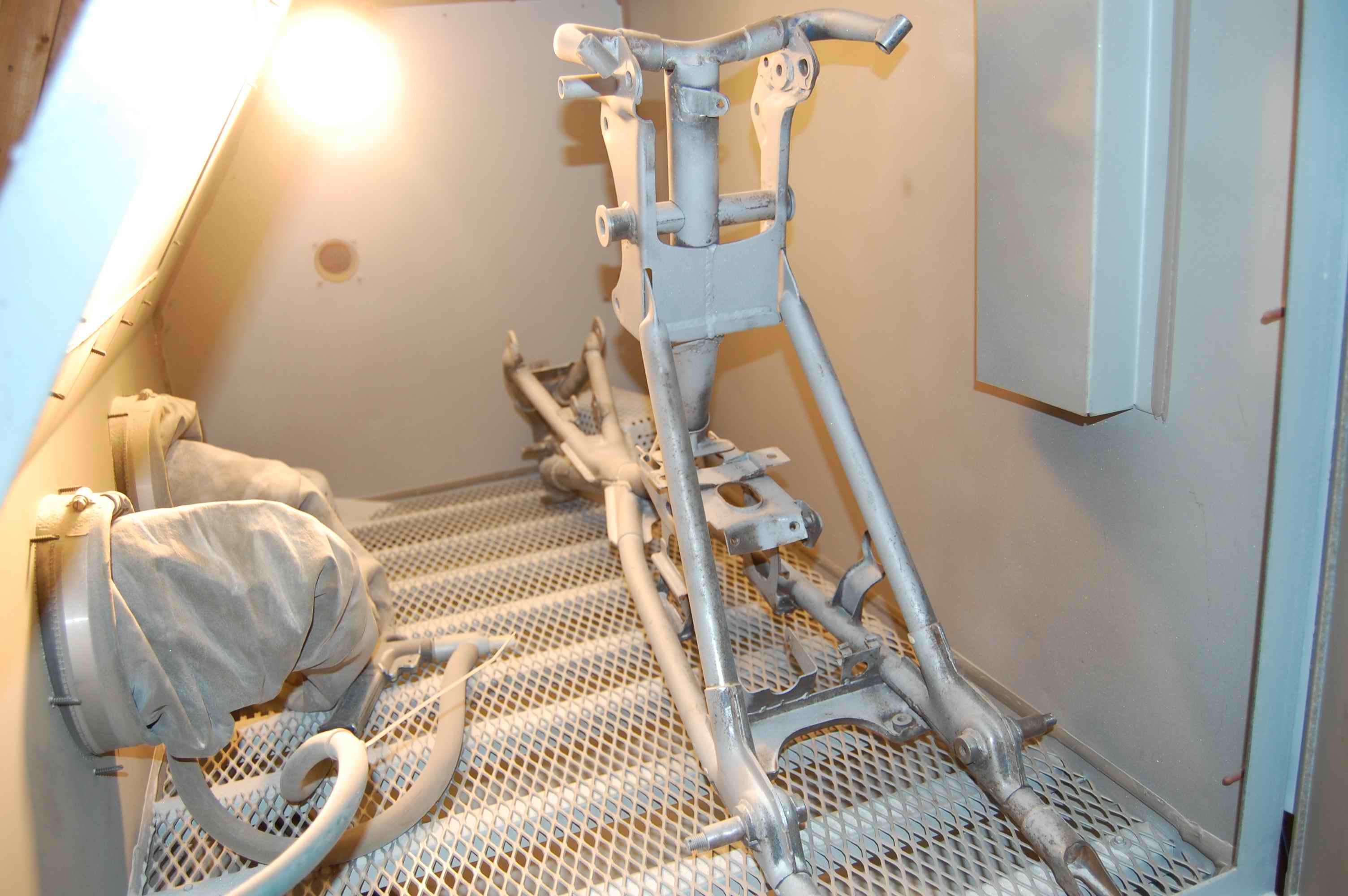 I’ve been back to Kerrville twice since last post here. I’m so lucky to live within striking distance of such a resource. First visit in early December was about 50-50 sandblasting, mostly finished on this trip, and just visiting with Ed. I really enjoyed hanging out in his shop and watching him work. I’m too ignorant to get much out of it technically/mechanically, but attitude-wise, very educational. I watched him rebuild a couple of starters, a job he really enjoys. By the time he gets done with a starter it’s mechanically perfect and sandblasted/painted and cosmetically as good as it can get. For a really reasonable price, too. Somebody sent him a pair of carbs they couldn’t get to work, and he diagnosed the problem immediately after getting the bowls off. “Floats set wrong,” he said, “not getting any gas, no wonder it wouldn’t run.” Also discovered the slides were reversed, ie left slide in right carb and vice versa. Seems like he replaced one of the banjos too, can’t remember why. At any rate, it took him about half an hour, and I bet that guy was really happy to get them back.
