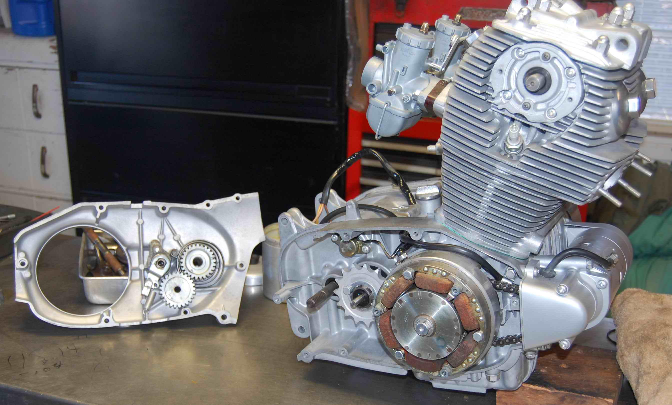 Next trip in early January finished up blasting on a few parts, rebuilding brakes, welding a couple of cracks on frame, removing, lubing, and replacing wheel bearings, lubing speedo drive, playing with horn to make it work, and getting through my extensive list of parts needed. Also picked up finished (and beautiful) rebuilt engine, with rebuilt carbs and starter installed. Lots of new internal engine and transmission parts including new clutch and 4x oversized pistons, rings, sleeves (was already 2x from unfortunate lean-running incident back in the day.) Ed says it should go another 20k miles easy if I take care of it.