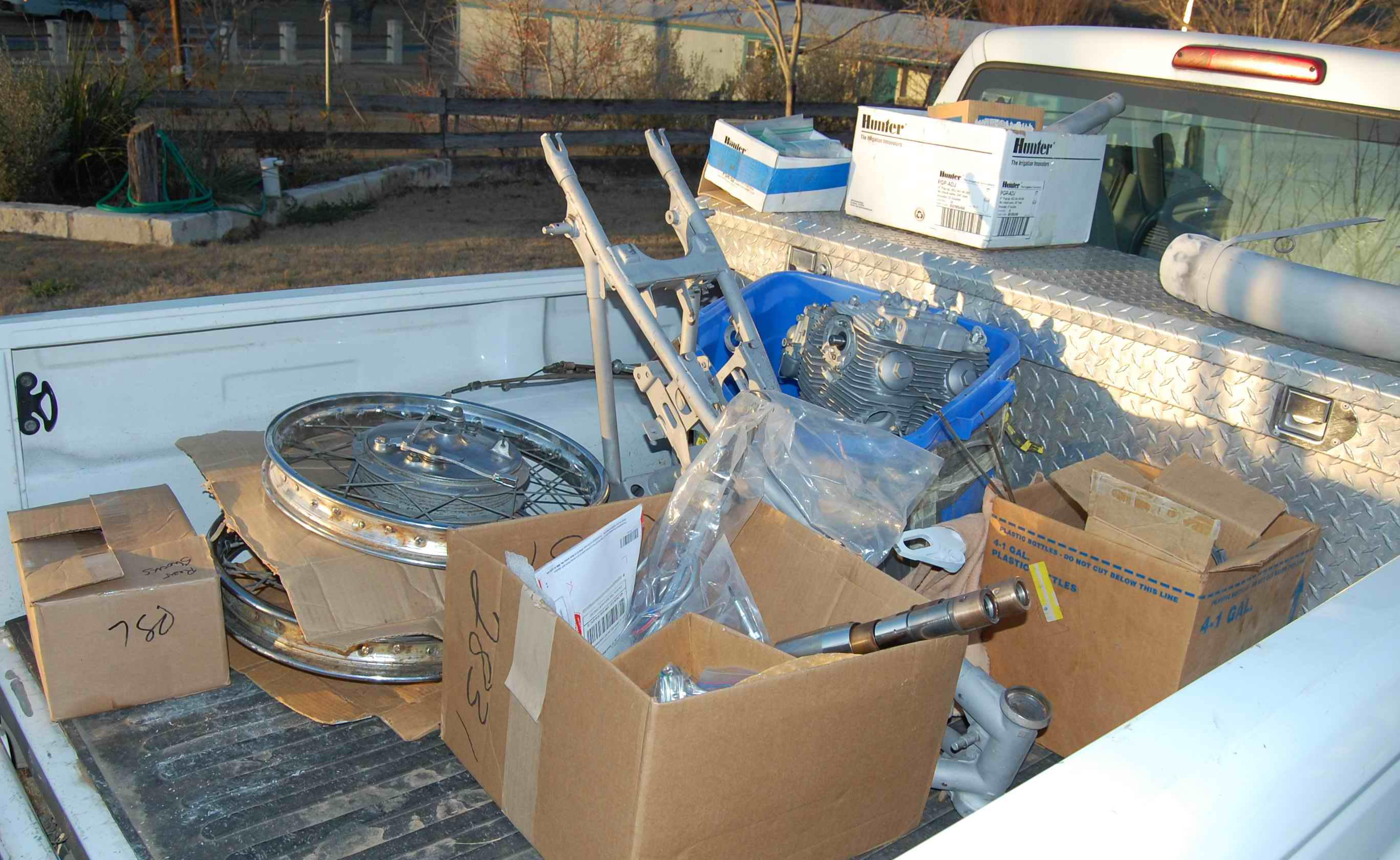 Everything else is about ready to go. Rebuilt engine is sitting in living room, along with rebuilt front fork tubes, wheels, and everything else I can’t stand to leave outside on porch. Where am I going to keep park bike after it’s put together? Good question, but for now I’m keeping anything that could rust or tarnish inside.