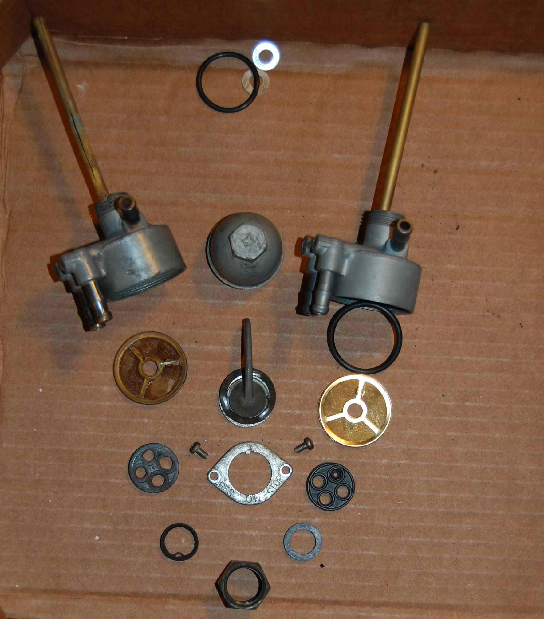 Also new front and rear tires and brake shoes. A fuel petcock body. Air cleaners with brackets and rubber bumpers and a pair of serviceable tubes to go to carb. No springs. Triple tree top part (I’d broken off one handlebar mount screw, botched the extraction which was probably hopeless anyway.)