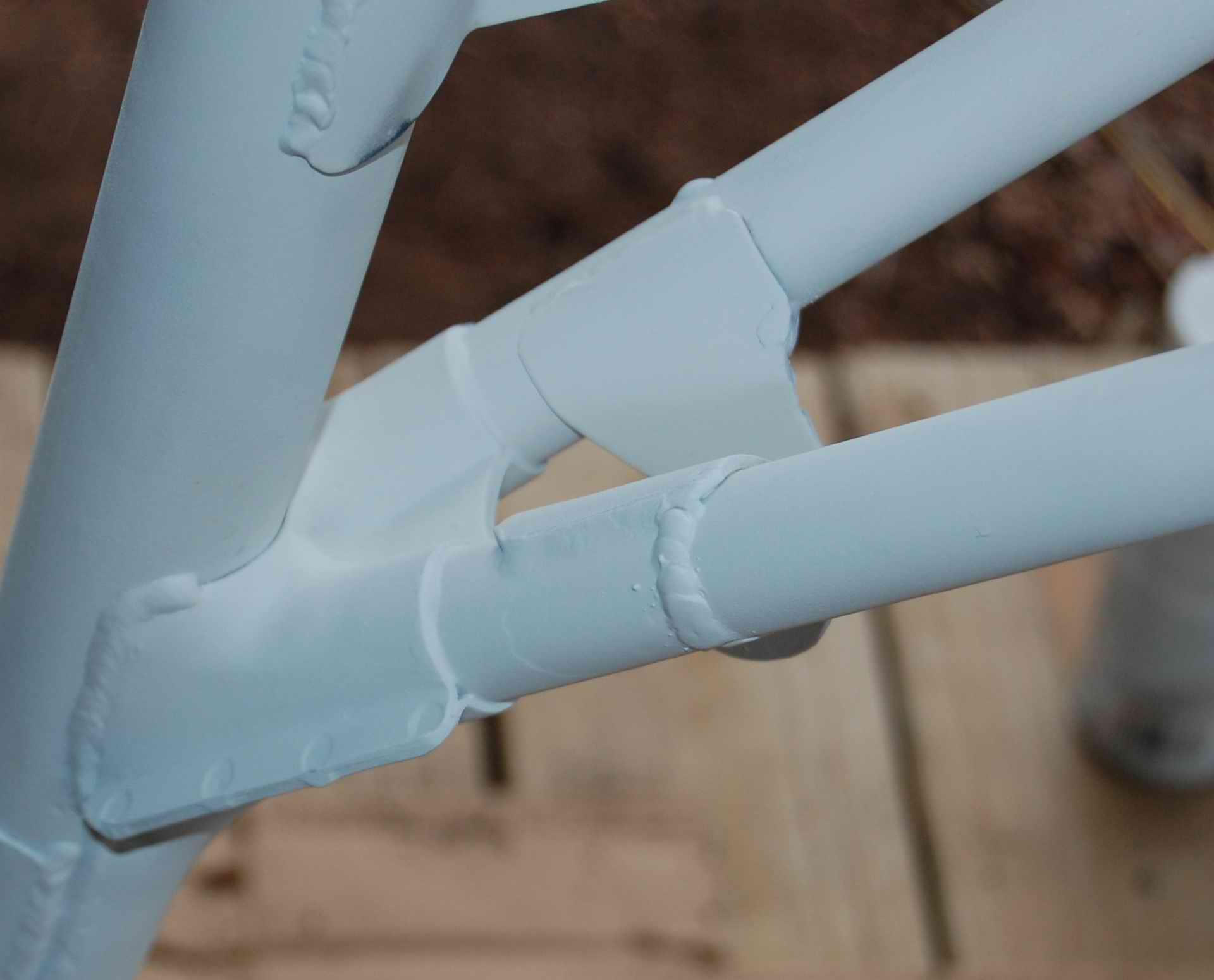 I’m working on getting wheels tuned up a bit so spokes don’t sound so much like a xylophone when dinked on. Tone deaf as I am, I’ve got ‘em all within an octave or so at this point, gonna try going around one more time. It’s frustrating, as tightening in any one place seems to change tension on all the other spokes as well. My jury rigged “truing stand” with one end of axle on table and other end flying from wire from ceiling reveals minimal runout and out-of-round (less than 2mm), which Ed says is just fine.