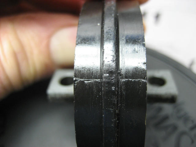 I lapped the valves, checked with solvent and they seal well. Cam's and lifters look good. The spocket on the cam was slightly loose on the center. I wire welded it carefully, being certain not to get it too hot. One problem I did notice on disassembling the head is that the lefthanded nut on the center assembly was loose. The cam adjuster wheel was shot and may have been a related problem. There is also a small amount of wear on both sides of the center rib on the large idler wheel. There is a line on the wheel that goes across it (see attached picture.) Is this normal? It doesn't appear to be damage.