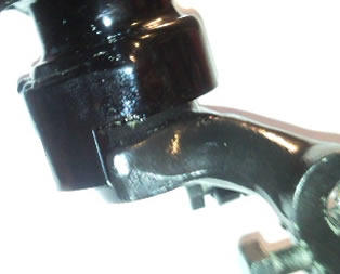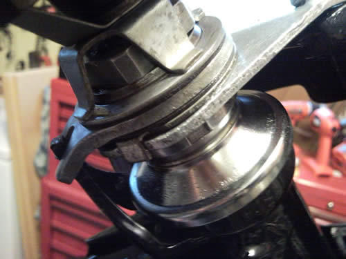 Notice the gap between the bridge plate and the nut below.. this is with the bridge plate bolted to the top of the forks, the forks bolted into the bottom of the steering stem, and the steering stem tightened in with all bearings in place (and in their