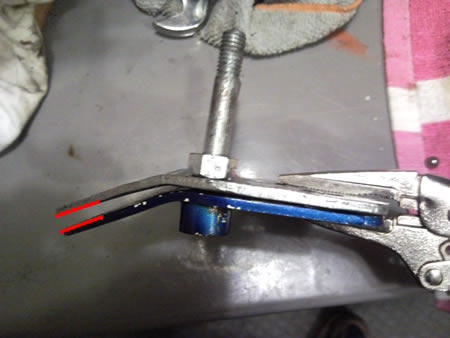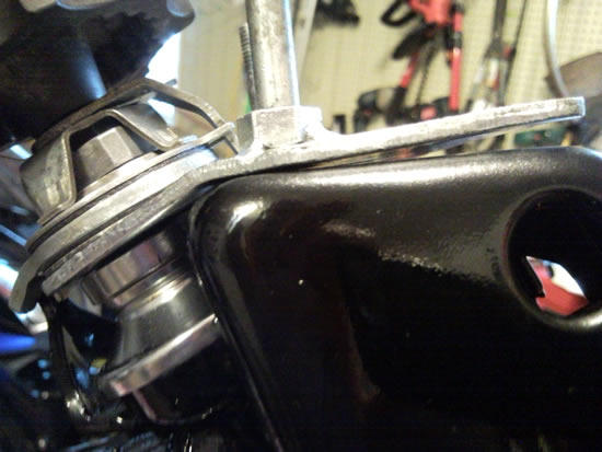 Take a look at the photos below and you'll see that I dug around in my boxes and found another bridge plate from another year to compare with. What I'm seeing is somehow the bend on the original bridge plate is not quite right. My guess is a PO assembled this by bolting the plate to the steering stem and to the top of the forks then rotated the forks down until they could fit the bolts in the lower part of the steering stem.. I'm sure it fit fine like that, but it put a lot of stress on things as that bridge plate acted like a spring.