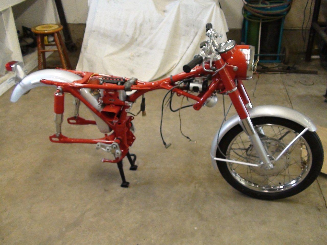 Finally got almost all my pieces. Enough to get started putting everything back together. I bored the cylinders and put in new pistons and rings, new valves, all new seals, replaced any bearings that needed it, shimmed the tranny, rebuilt the carbs, new points, cam chain and roller, all new sprockets and chain, new tubes and tires, wheel bearings, cables, new repro mufflers, and everything that can be painted or polished has been. The pictures are off a little colorwise, as I din't have the white balance set properly. The red is a fire engine red, but it looks a little orangey under the flourescent lights. I'm just waiting until I can get a hand to install the engine. The last thing I want to do is drop it at this point!