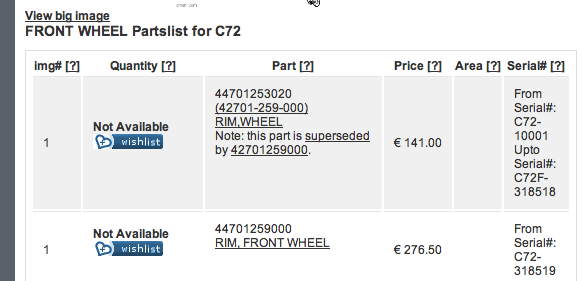 Graham, I beg to differ on the front and back rim part numbers bcoming one. Looking at the '64, '68 and '73 parts catalog, there are 4 "sets" of different part numbers for rims, each of which shows a different part number for the front and back.