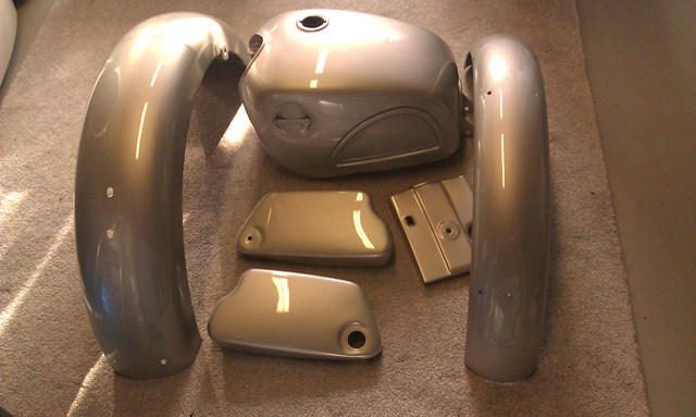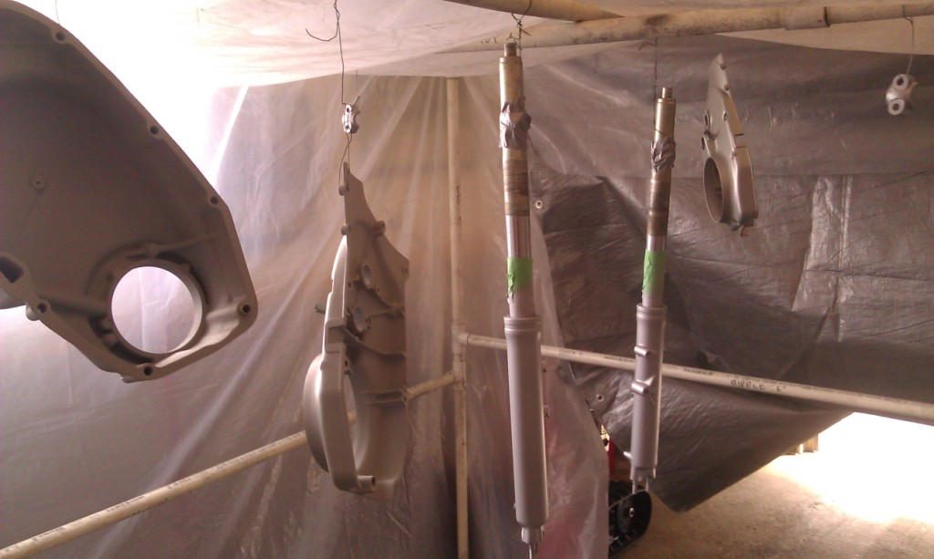 Doing some painting today in my homemade paint booth made out of PVC pipe and plastic draped over it. Painted the covers in a 1650 aluminum engine paint and also painted the forks in aluminablast by Seymour paints. Everything turned out really well, now to let it dry, a little wet sanding and putting a couple of coats of clear enamel on everything. So, my question is this: since the engine paint for the covers is basically gas resistant, will putting that clear enamel on it be a good idea or will that enamel run or be affected should it get gasoline on it? Also, should I wet sand and put clear enamel on the forks or leave them alone?