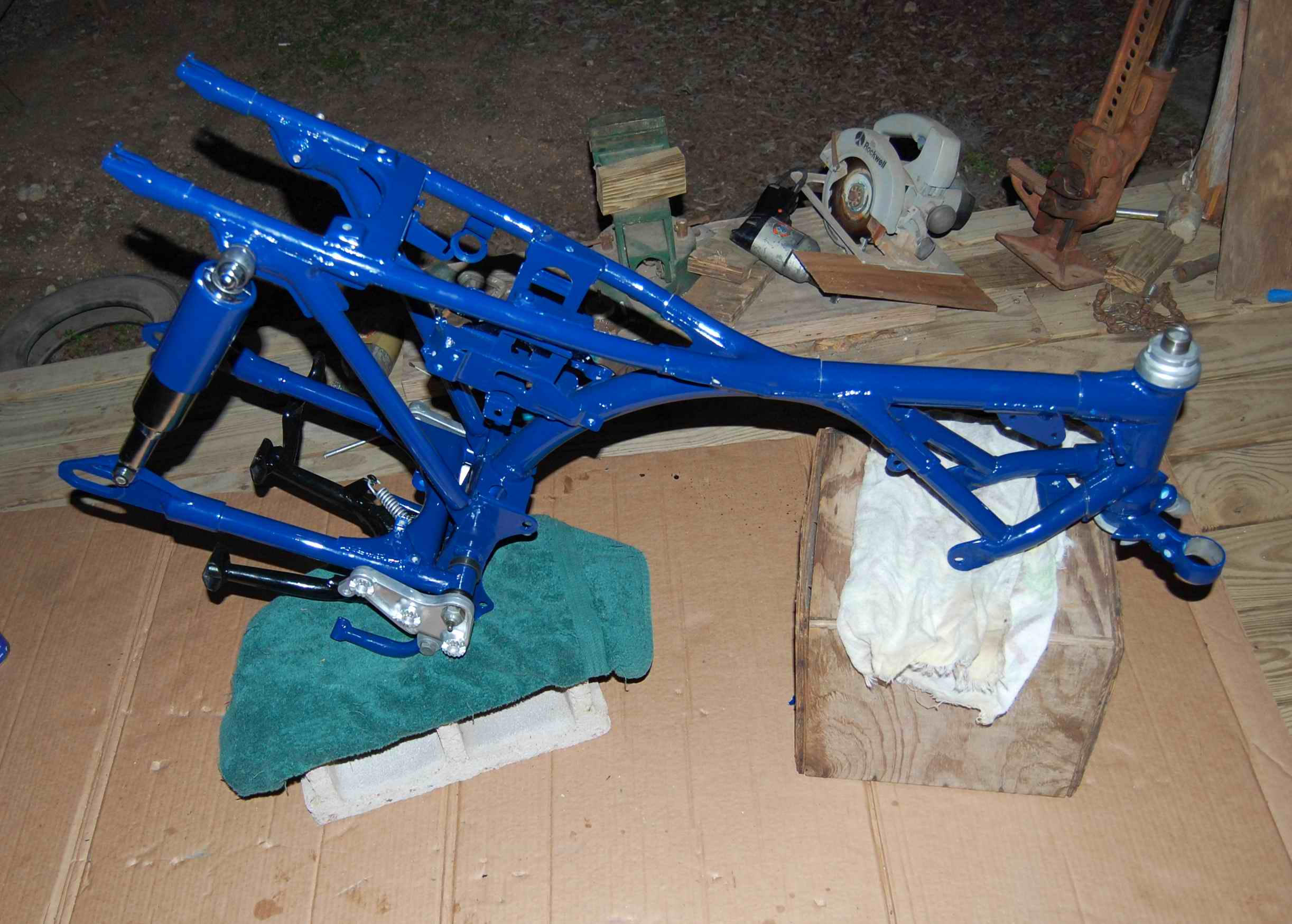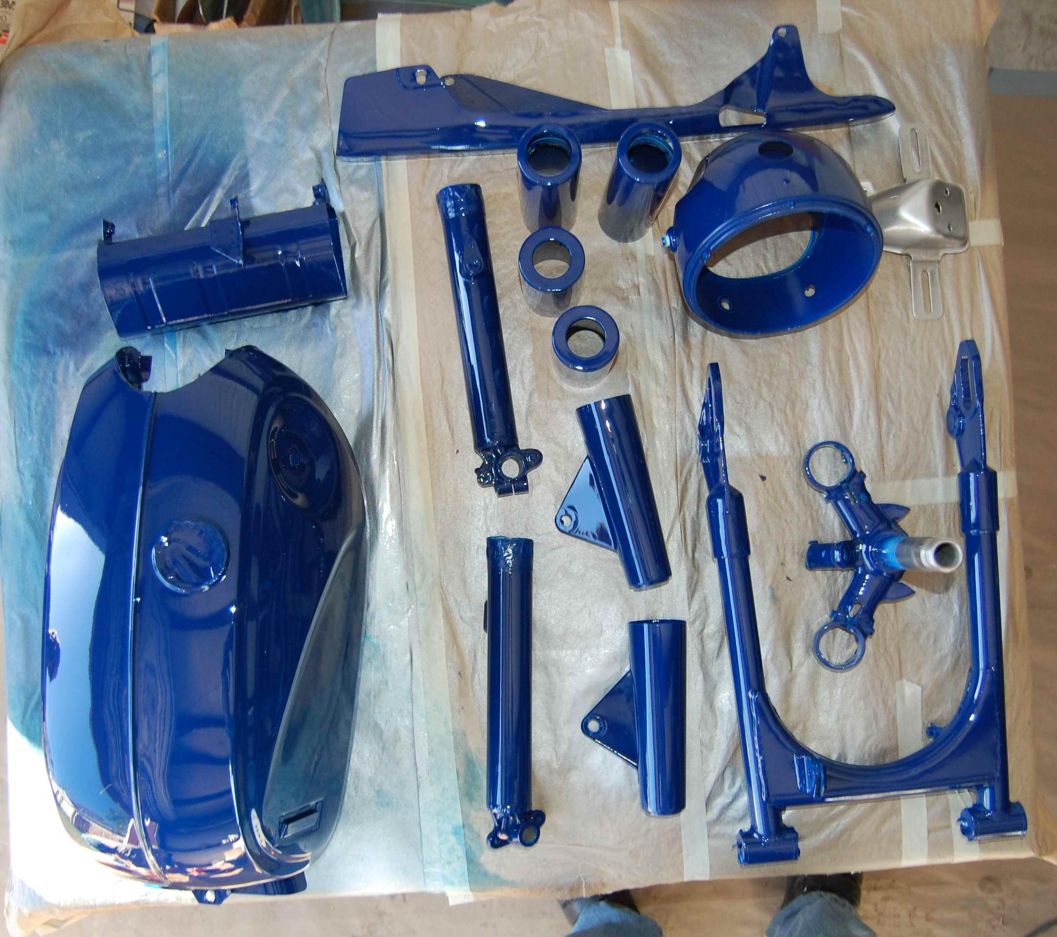 Here's progress so far, another long day. I made a couple of trips to town, finally located, ordered, and picked up next day the elusive Krylon #1403. O"Reily's Auto parts. Also got rear tires mounted so I'm lined out for awhile.
