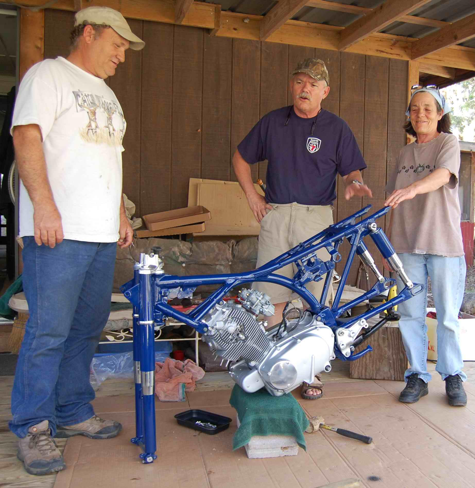 From left, brother in law, brother, lil' sister. We just wrastled the frame onto the engine. Didn't even ding up the paint. I'm proud of my helpers. Position everything's in right now is how things settled down after the wrastling.