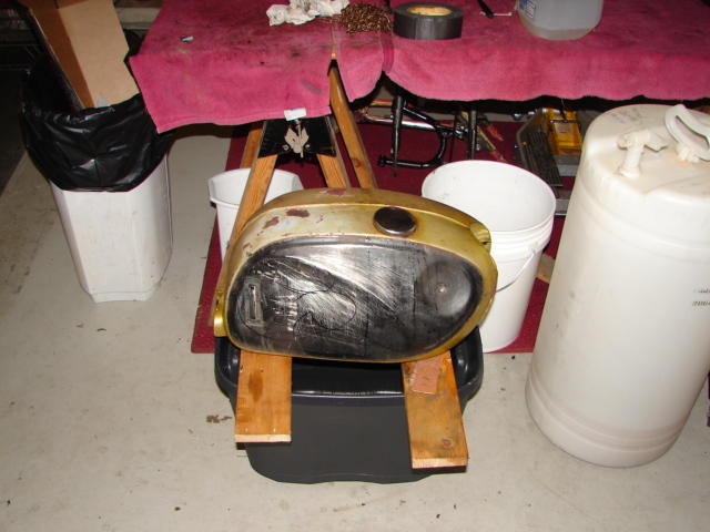 For lack of anything better to do (till payday when I can order some tranny parts) I got my spare tank out -shook it for a while with a handful of short chain lengths inside, and set it up with the milkstone remover. I have had good results with this before. I may have to do this twice this time. I dont know how much crap I loosened up. Anyway, here's a picture of my setup. Pretty basic. Plug the petcock hole with a cork, and put a lenght of fuel line on the crossover, then bend it double to kink it and give it a couple of wraps with wire to keep in kinked. Wont leak.