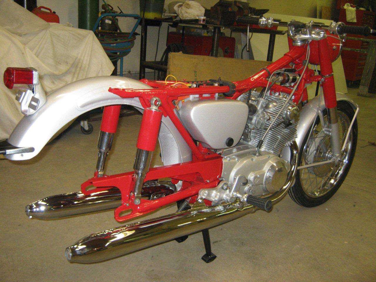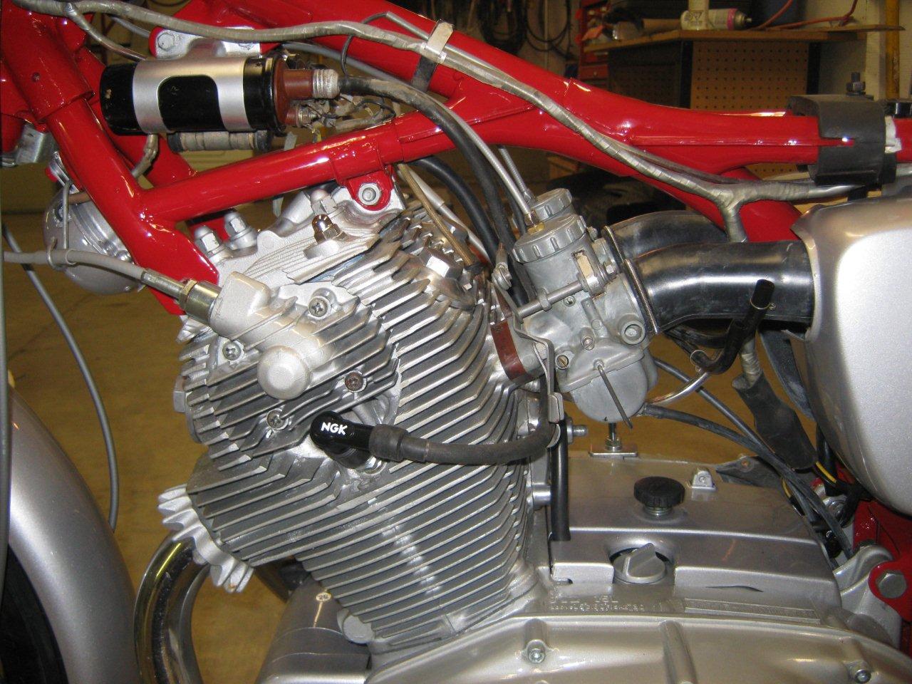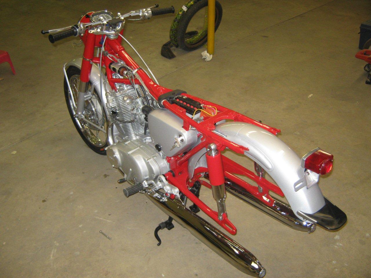 clhiller wrote:Finally got almost all my pieces. Enough to get started putting everything back together. I bored the cylinders and put in new pistons and rings, new valves, all new seals, replaced any bearings that needed it, shimmed the tranny, rebuilt the carbs, new points, cam chain and roller, all new sprockets and chain, new tubes and tires, wheel bearings, cables, new repro mufflers, and everything that can be painted or polished has been. The pictures are off a little colorwise, as I din't have the white balance set properly. The red is a fire engine red, but it looks a little orangey under the flourescent lights. I'm just waiting until I can get a hand to install the engine. The last thing I want to do is drop it at this point!