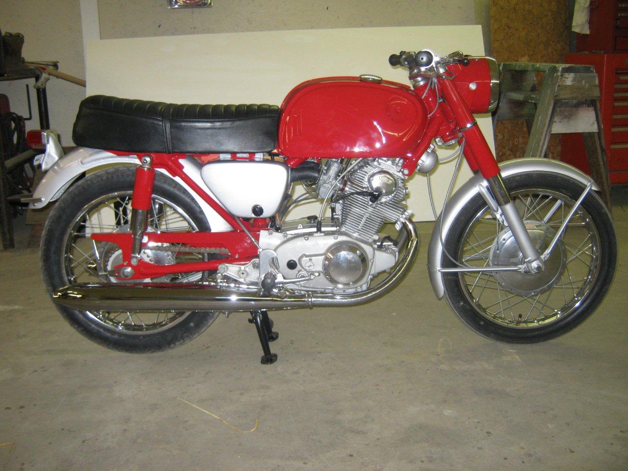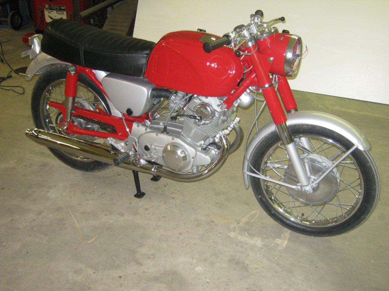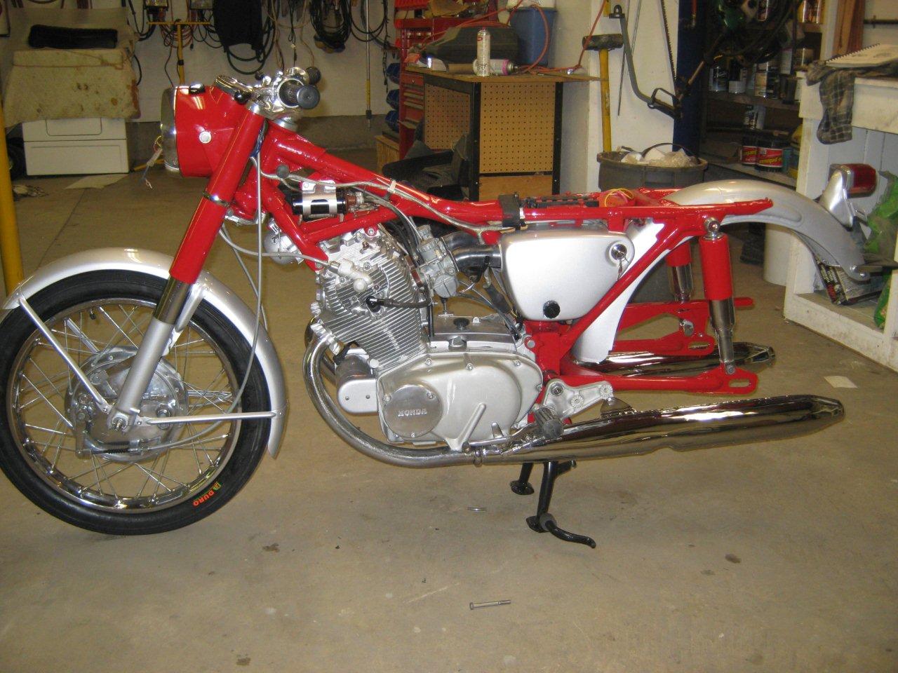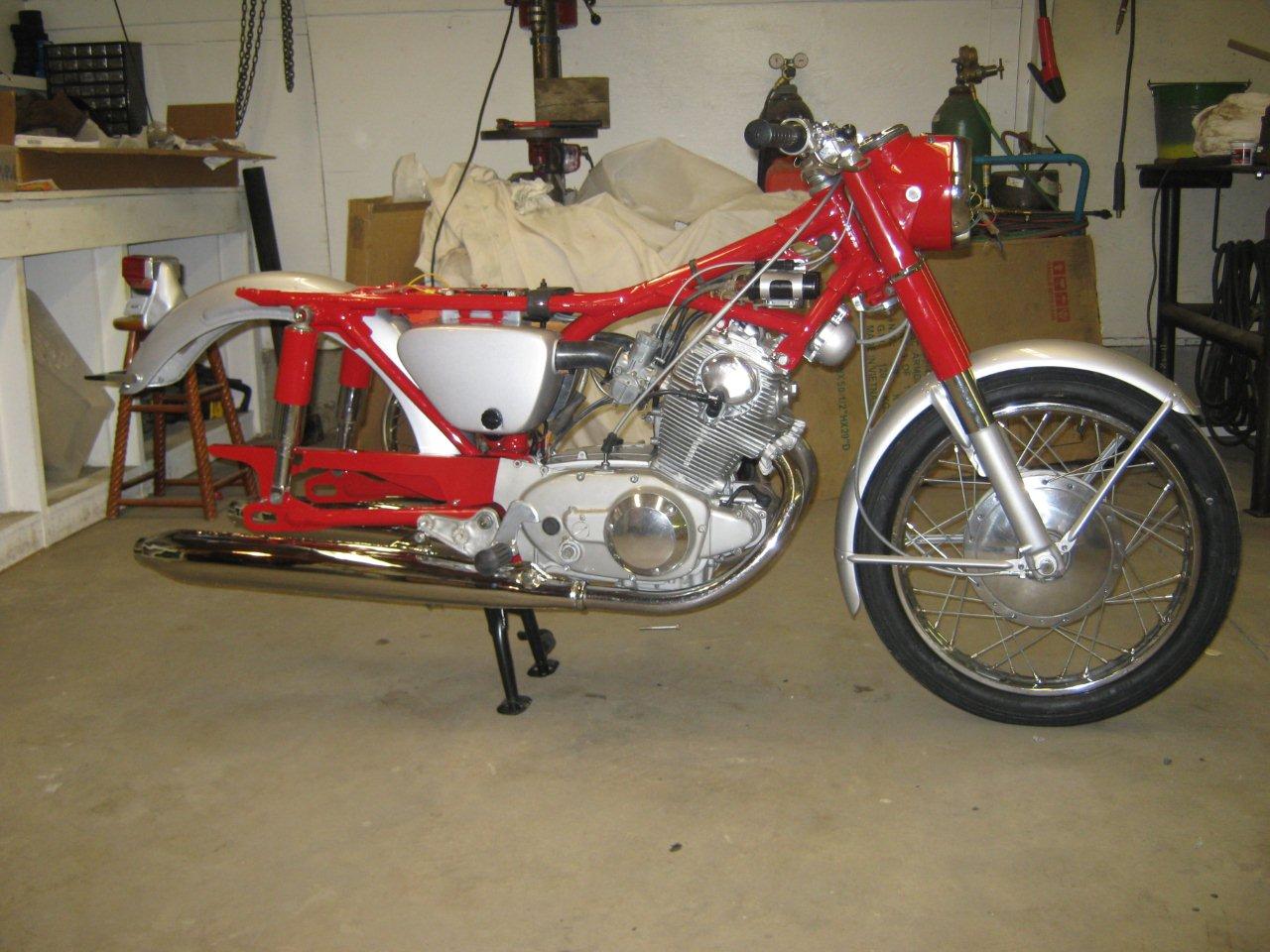 clhiller wrote:Finally got almost all my pieces. Enough to get started putting everything back together. I bored the cylinders and put in new pistons and rings, new valves, all new seals, replaced any bearings that needed it, shimmed the tranny, rebuilt the carbs, new points, cam chain and roller, all new sprockets and chain, new tubes and tires, wheel bearings, cables, new repro mufflers, and everything that can be painted or polished has been. The pictures are off a little colorwise, as I din't have the white balance set properly. The red is a fire engine red, but it looks a little orangey under the flourescent lights. I'm just waiting until I can get a hand to install the engine. The last thing I want to do is drop it at this point!