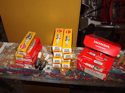 But I had to figure this out the hard way. SEVERAL of the parts I have ordered for my Dream have been wrong (many people obviously send stuff for a CB77 thinking it's the same). The non-resistance thing in the plugs is particularly challenging...more than one NGK plug dealer has given me 'DR8HS' plugs 'coz their books show it as replacement for 'D8HA' (pile in middle in photo). It's not a replacement, it is the resistor type!