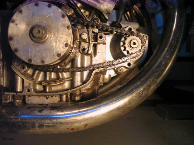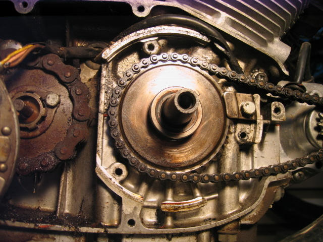 I also see that the insulation around the starting motor cable has been scraped away...perhaps this can be seen in the attached photo. I don't know what could cause this other than the starter chain, but it doesn't seem possible that there would be enough chain lash for it to reach that high. Perhaps this is something that occurred in the past because the cable slipped down closer to the chain at some point.